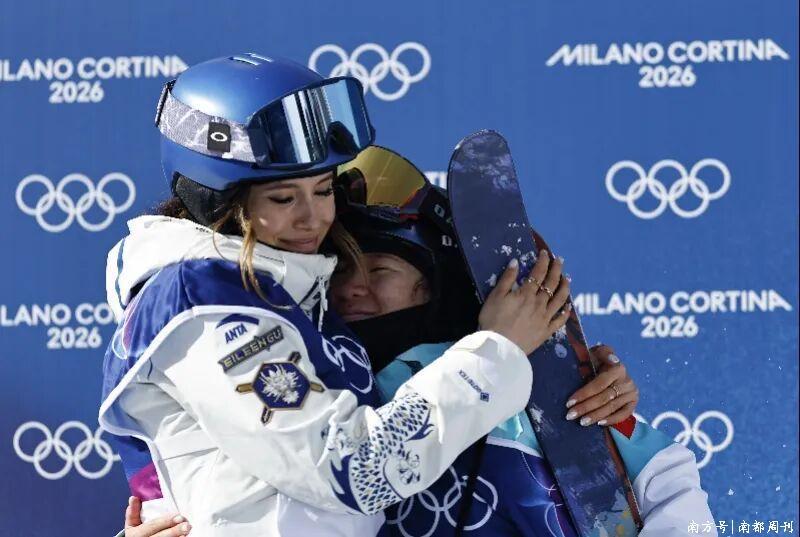 谷爱凌(左)、李方慧在比赛后拥抱庆祝。新华社发