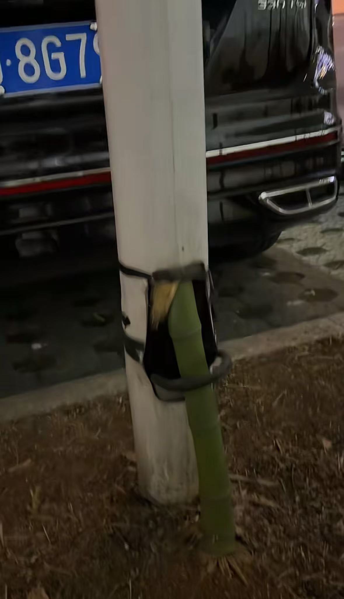 在何先生拍摄的视频中,这棵竹子从地面拔节生长,根部距离路灯杆仅数厘米,冒出地面约二三十厘米后即从路灯杆根部一个豁口“钻”入灯杆,神奇的是,在长达五六米的路灯杆另一头,一簇竹子枝叶竟然在高空冒出,繁茂葱郁,令人称奇。